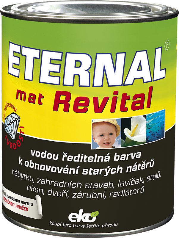ETERNAL mat Revital je hedvábně matná univerzální vodou ředitelná akrylátová barva pro vnitřní i venkovní použití určená k nátěrům dřeva, kovových podkladů opatřených antikorozním nátěrem, dřevovláknových a dřevotřískových desek, sádrokartonu, nepochozího betonu a třískocementových desek. Vzhledem k velmi dobré přilnavosti na starých syntetických a olejových nátěrech je velmi vhodný pro obnovovací nátěry.Vyznačuje se velmi dobrou kryvostí, dobrým rozlivem, rychlým zasycháním.